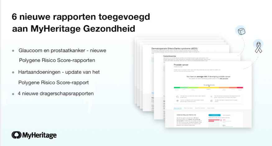 MyHeritage Gezondheid is uitgebreid met zes nieuwe gezondheidsrapporten. De update bevat nieuwe polygene risicoscores in PRS-rapporten voor glaucoom en prostaatkanker, een update van het PRS-rapport voor hartaandoeningen en dragerschapsrapporten voor galactosemie, carnitine palmitoyltransferase deficiëntie type 2, dermatosparaxis Ehlers-Danlos-syndroom (dEDS) en PMM2-congenitale defecten van de glycosylering.