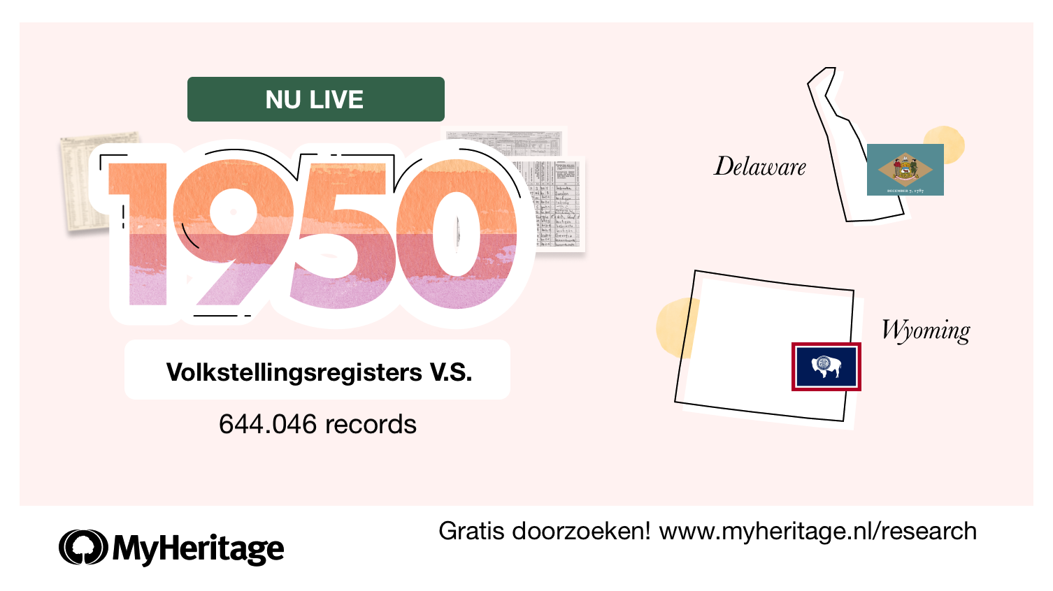 Het verheugt ons u te kunnen meedelen dat MyHeritage de eerste tranche van de geïndexeerde records (en de bijbehorende scans) van de Amerikaanse volkstelling van 1950 heeft gepubliceerd – en dat u er gratis in kunt zoeken! Afgelopen vrijdag, 1 april, enkele uren nadat het Nationaal Archief de scans van de volkstelling van 1950 had vrijgegeven, werd MyHeritage het eerste commerciële bedrijf dat een volledige collectie van de scans van de volkstelling van 1950 publiceerde. Vandaag kunnen we met trots aankondigen dat we – naast de publicatie van deze hoogwaardige scans – ook een index hebben gepubliceerd van 644.046 volkstellingsregisters uit de staten Wyoming en Delaware. Die index is daarmee compleet. Als u verwanten hebt die tijdens dit keerpunt in de geschiedenis in één van deze staten woonden, dan zult u waarschijnlijk belangrijke informatie over hen ontdekken.