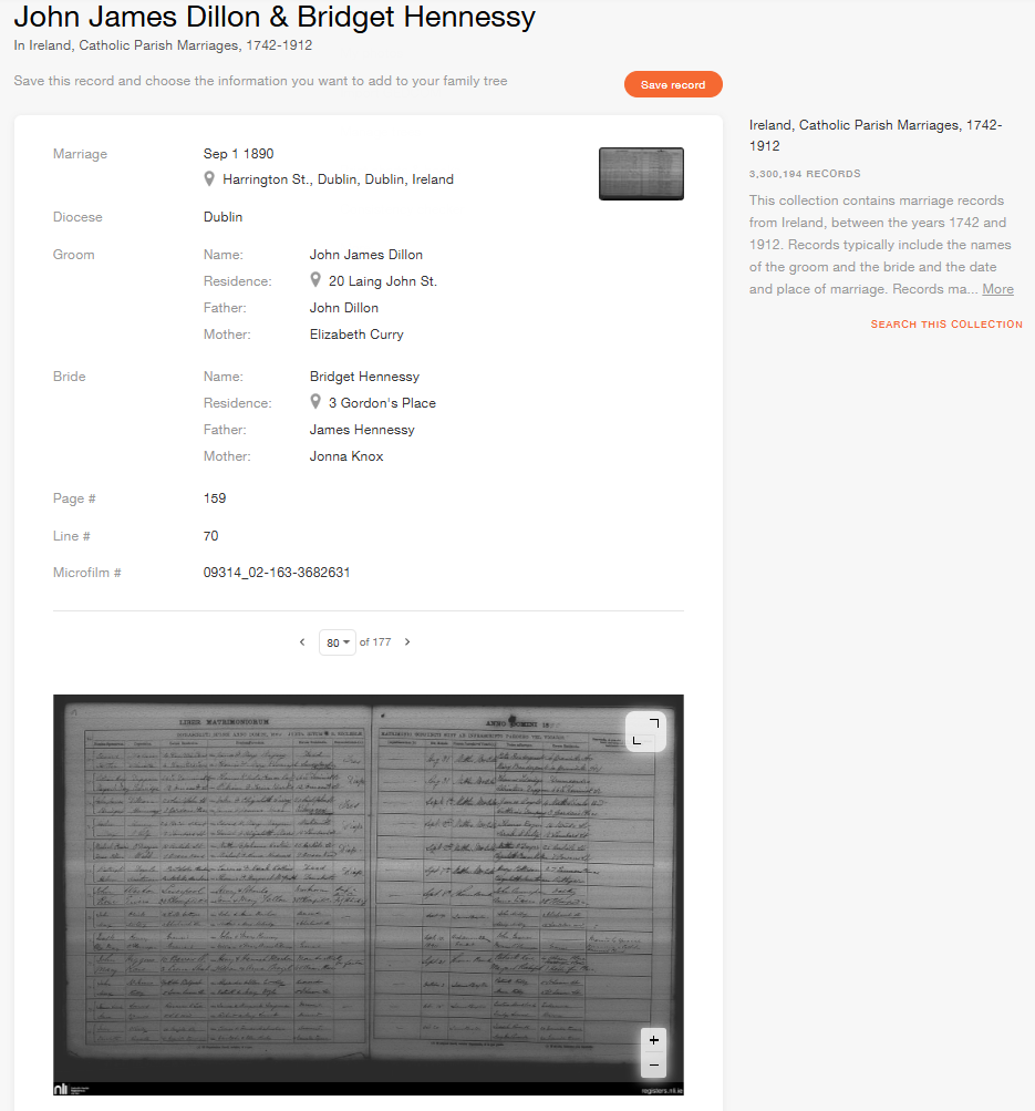 In de collectie Ierland, Katholieke parochie huwelijken, 1742–1912, vonden we een document over het huwelijk in 1890 van John James Dillon en Bridget Hennessy in de parochie Harrington Street, Dublin.