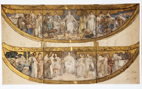 De afbeelding hierboven is gemaakt tijdens de voorstudie van Prof. Van der Waay. Het in opspraak geraakte rechter zijpaneel stelt een huldebetoon voor van de voormalige koloniën.