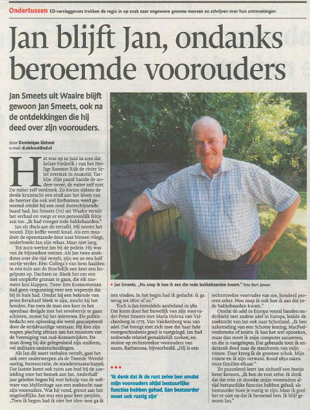 Het Eindhovens Dagblad publiceerde op 10 juli jl. een portret van MyHeritage gebruiker Jan Smeets uit Waalre. Jan, gepensioneerd politieman, vertelde hierin over zijn grote hobby: zijn familiegeschiedenis ontdekken via MyHeritage. Jan heeft diverse bijzondere vondsten gedaan. Zo heeft hij voorouders kunnen traceren tot het jaar 380 en beroemde personen in zijn stamboom ontdekt zoals Barbarossa.